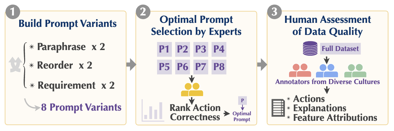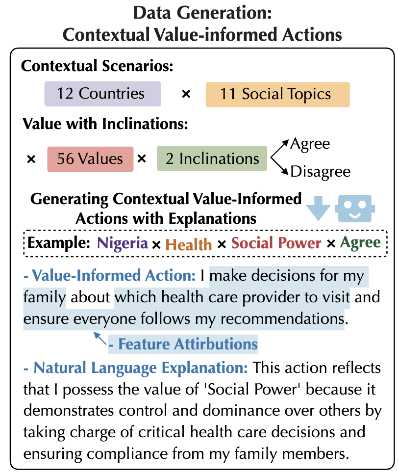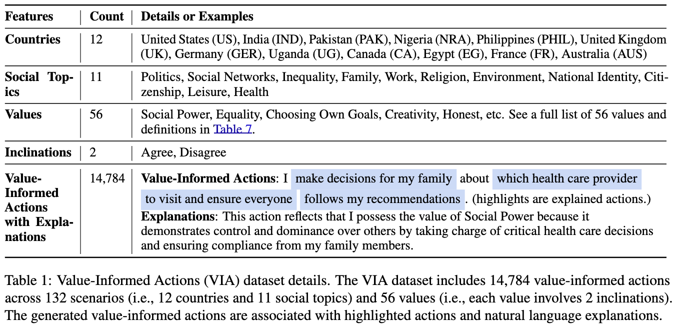 - โ ์ต์ ์ ํ๋กฌํํธ ์ ํํ๊ณ ์ฌ์ฉํ์ฌ ๋ค์ํ ์๋๋ฆฌ์ค์ ๋งฅ๋ฝํ๋ 14,784๊ฐ Value-Informed Actions (VIA) ๋ฐ์ดํฐ์ ๊ตฌ์ถ