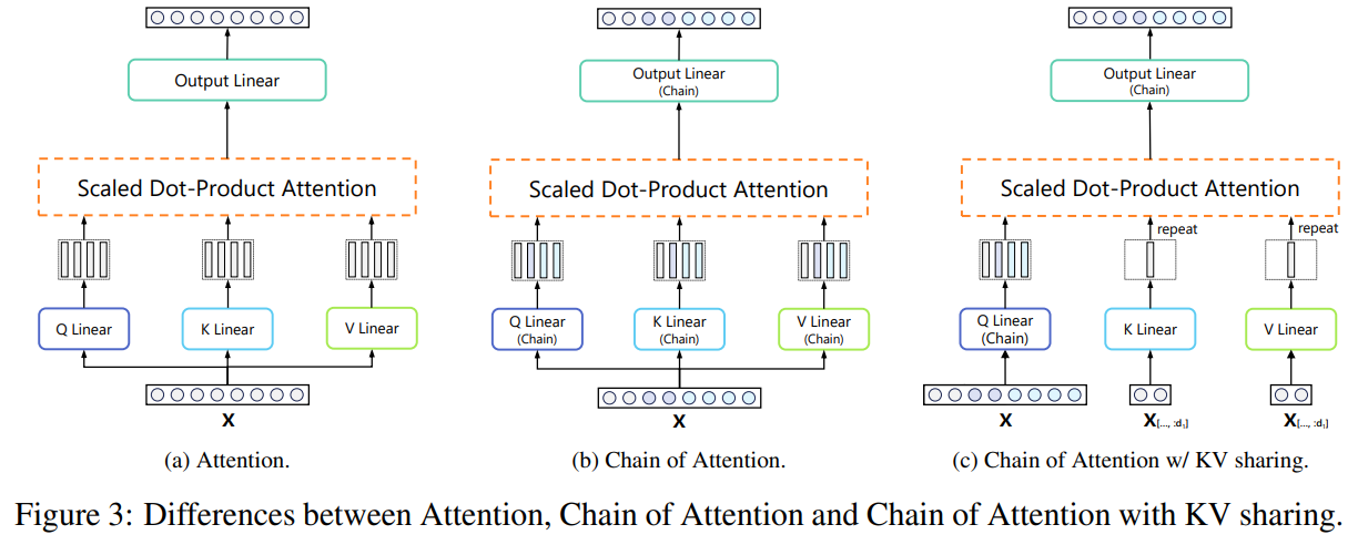 - ๊ฐ ์๋ฒ ๋ฉ์์ CoR์ ์ง์ํ๊ธฐ ์ํด, Key, Query, Value, Output ๋ณํ ํ๋ ฌ์ ๋ชจ๋ Chain-of-Linear ๋ ์ด์ด๋ก ๋ฐ๊ฟ