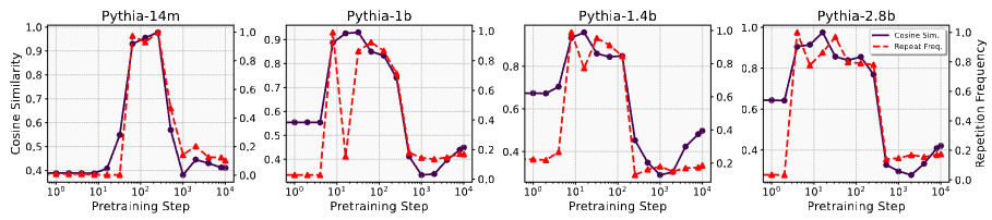 - 14M, 1B, 1.4B, 2.8B Pythia ๋ชจ๋ธ์ ์ด๊ธฐ ํ๋ จ ๋จ๊ณ์์ ์ถ๋ ฅ ์ํ์ค์ repetition bias ๋ฐ๊ฒฌ