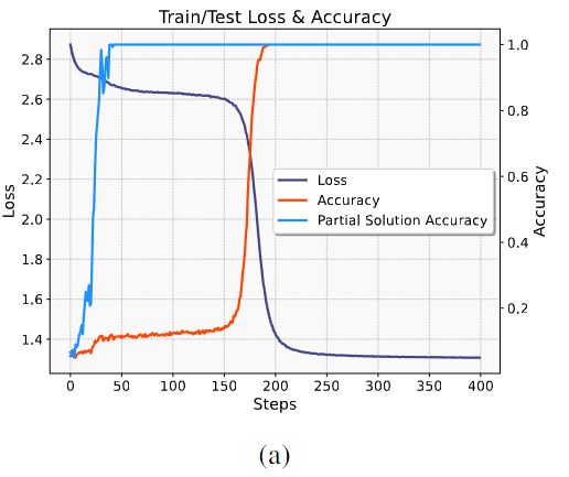 - ์ฒซ๋ฒ์งธ ์ถ๋ ฅ ํ ํฐ ์์ธก ์ ํ๋์ธ partial solution accuracy๊ฐ ๋น ๋ฅด๊ฒ ์ฆ๊ฐ