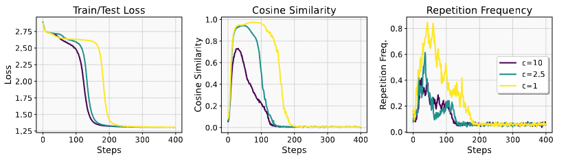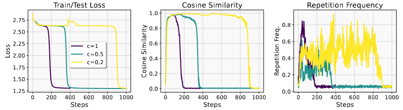 - Transformer ํ๋ จ์ ์ด๊ธฐ๋จ๊ณ์์ repetition bias์ representation collapse๊ฐ ๋ฐ์ํ๋ฉฐ, ์ด๋ loss plateau์ ๋ฐ์ ํ ๊ด๋ จ์ด ์์