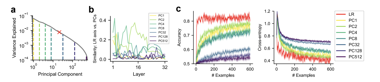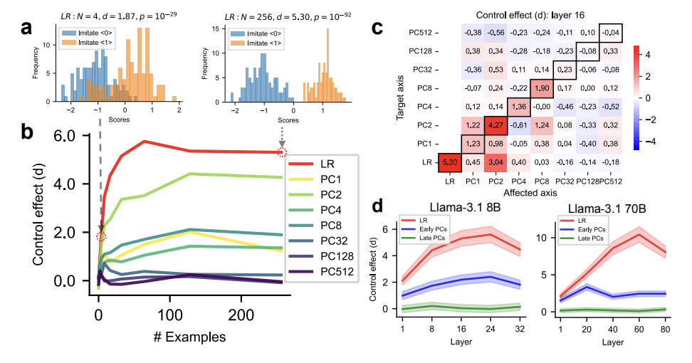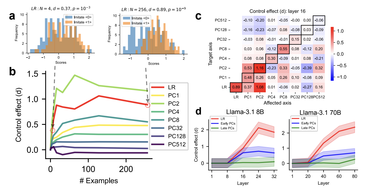 - (a): Label 0์ 1์ ๋ชจ๋ฐฉํ๋ ค๊ณ ํ์์ ๋์ Neural Score๋ถํฌ, (b): In-Context ์์ ๊ฐ์์ ๋ฐ๋ฅธ Control Effect, (c): Axis๊ฐ ๊ฐ์ญ(๋ ๋ฆฝ์ฑ ์์ค), (d): layer๋ณ Control์ ํจ๊ณผ