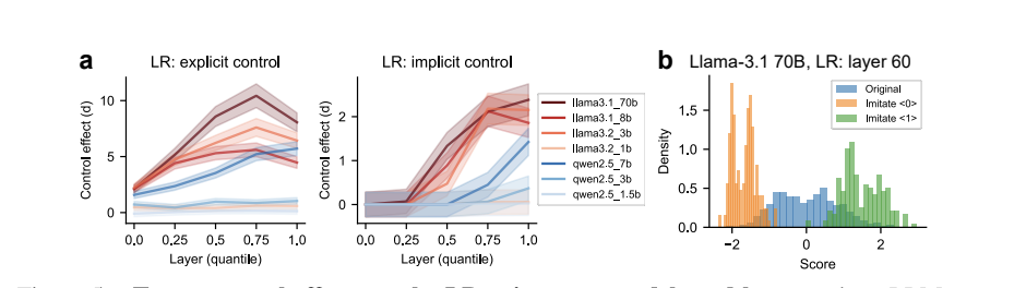 - (a): ๋ชจ๋ธ์ layer ๊น์ด์ ๋ฐ๋ฅธ Control Effect (b): Llama-3.1 70B์์ Control ์ด์ ๊ณผ ์ดํ์ ๋ถํฌ ๋น๊ต