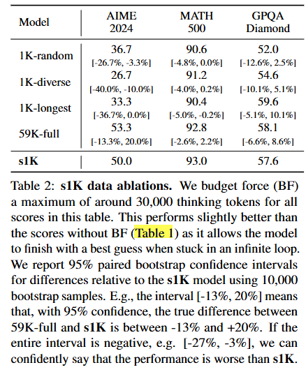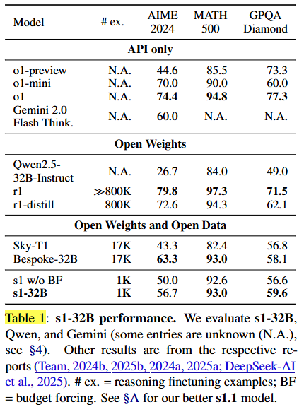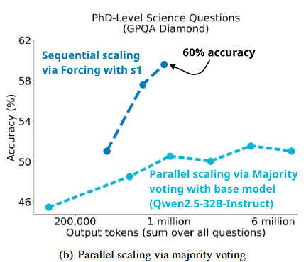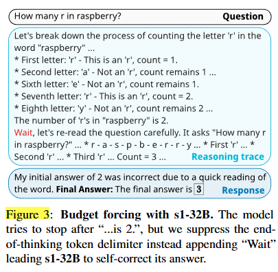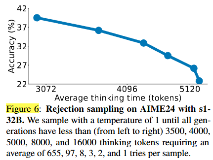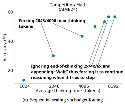 - budget forcing์ผ๋ก ์ธํ test-time scaling์ ํ๊ณ (๊ฒฐ๊ตญ ์ฑ๋ฅ์ด saturate๋๋ค!)