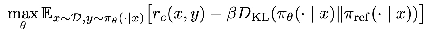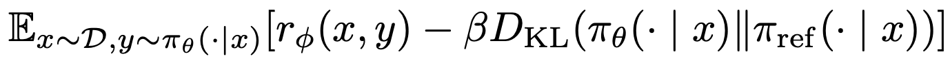- Reward ๋ฅผ ์ต๋ํ ํ๋ reference ๋ชจ๋ธ์์ ๋ฉ์ด์ง์ง ์๊ฒ KL ์ ๊ทํ๋ก ๊ณผ๋ํ ๋ณํ์ ์ต์