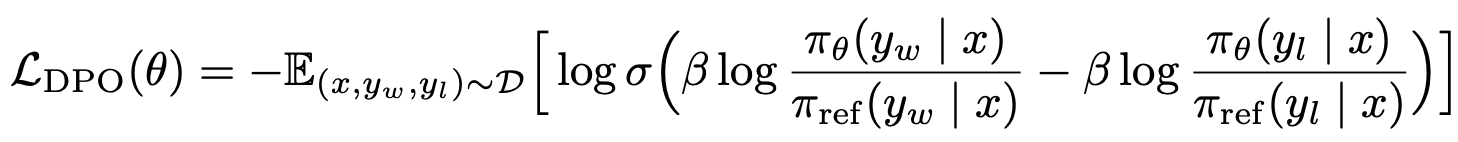 - RLHF์ฒ๋ผ reward model์ ๋ฐ๋ก ํ์ต/์ฌ์ฉํ์ง ์๊ณ , ์ ํธ ๋ฐ์ดํฐ(winner/loser)๋ง์ผ๋ก ์ ์ฑ ๏ปฟ๋ฅผ ์ง์ ์ต์ ํ