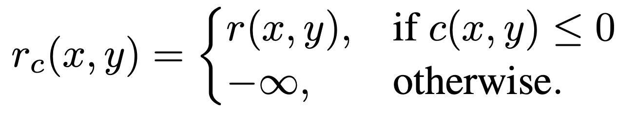 - ๊ธฐ์กด์ โ์ํํ ๋ต์ ์ ๋ ๋์ค๋ฉด ์๋๋คโ (unsafe์๋ต์ ํ๋ฅ 0; hard-constraint)๋ฅผ ๋ถ์ํ์ฌ ๊ทธ ๊ท์น์ ๋ง์กฑํ๋ฉด์๋ ๊ฐ์ฅ ์ข์ ๋ต์ ๋ด๋ ์ด์์ ์ธ ์ ์ฑ ์ด ์ด๋ค ํํ์ธ์ง ์ํ์ ์ผ๋ก ๋จผ์ ์ฐพ์๋