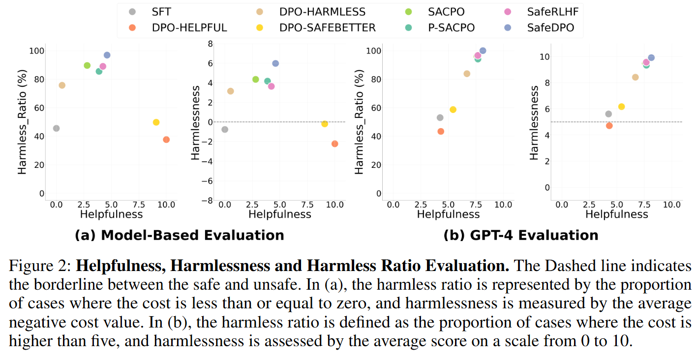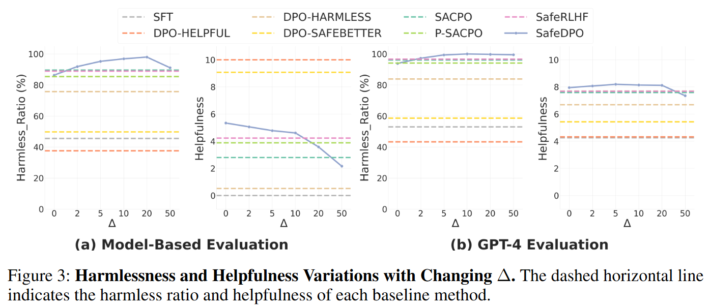 - SafeDPO๊ฐ ๊ฐ์ฅ ๊ฐํ๊ฒ unsafe๋ฅผ ์ต์ ํจ (Harmless_Ratio; a-1, b-1)