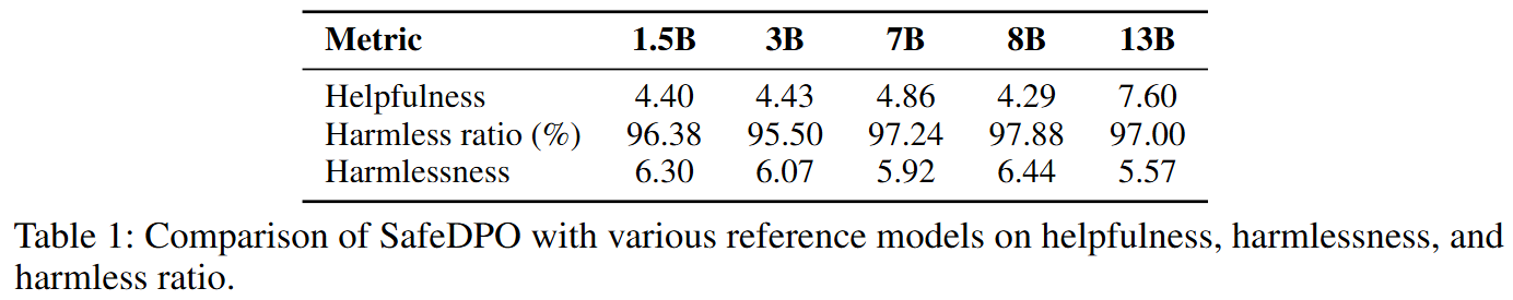 - ๋ชจ๋ธ ํฌ๊ธฐ๋ฅผ 1.5B ~ 13B๊น์ง ๋ฐ๊พธ๊ณ , ๋์ผ ํ์ดํผํ๋ผ๋ฏธํฐ๋ก SafeDPO๋ฅผ ์ ์ฉํด ์ฑ๋ฅ์ ๋น๊ต
