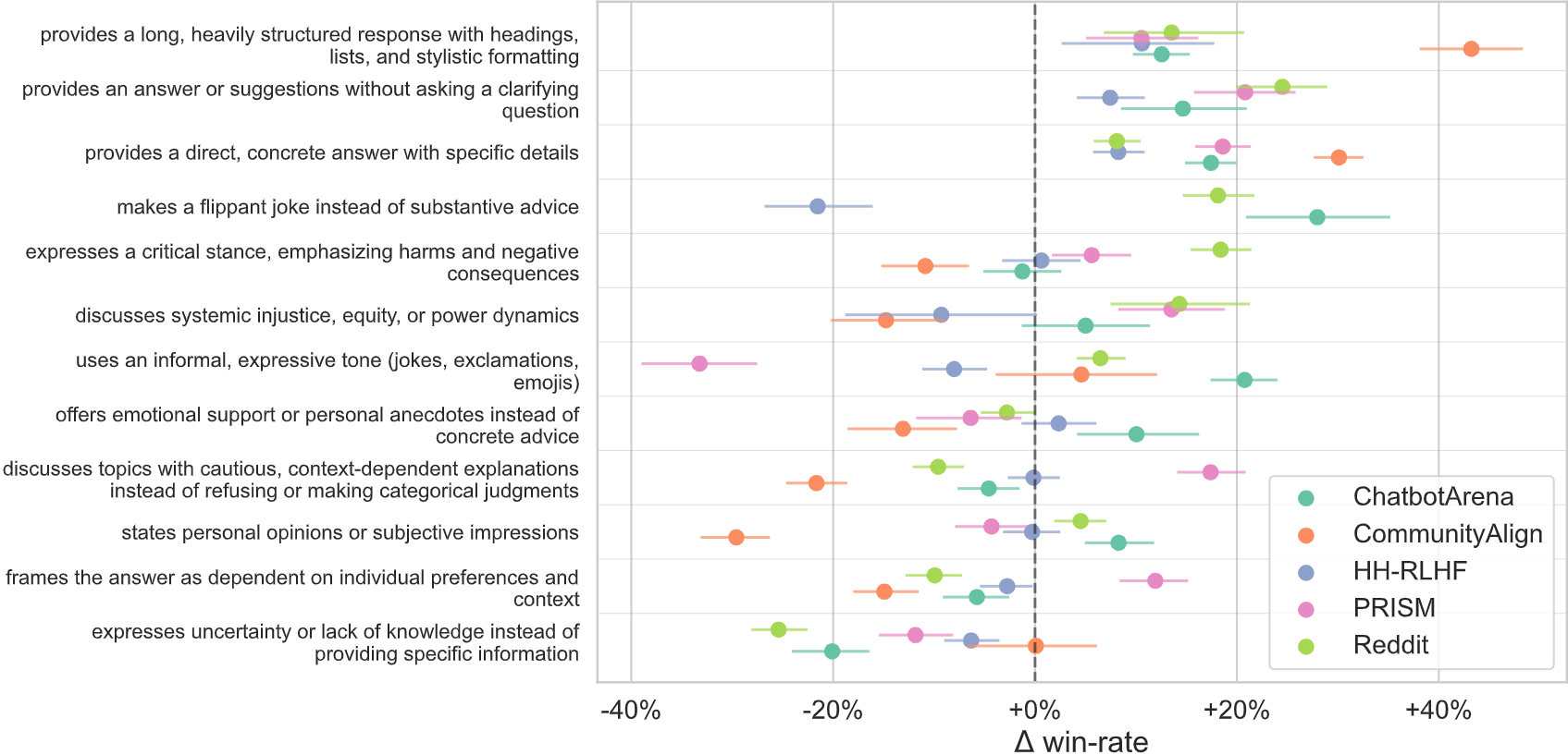 - ๊ฐ ์ : 5๊ฐ ๋ฐ์ดํฐ์ (ChatbotArena, CommunityAlign, HH-RLHF, PRISM, Reddit)