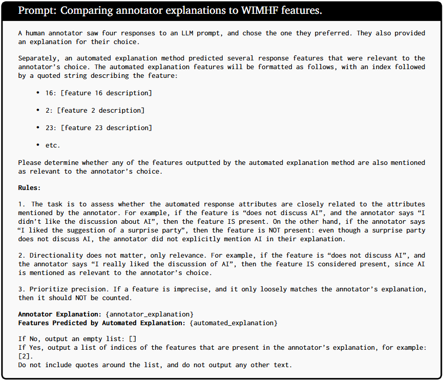 SAE๋ฅผ ํตํด preference dataset์์ ๋ ์๋ต ๊ฐ ์ ํธ๋ฅผ ๊ฒฐ์ ์ง๋ ์ ์ฌ์ ํน์ง(feature) ์ถ์ ์๋์ผ๋ก ์ถ์ถํ๊ณ , ์ด๋ค ์๋ต ํน์ฑ์ด ์ธ๊ฐ์ ์ ํธ๋ฅผ ๊ฒฐ์ ํ๋์ง ์์ฐ์ด๋ก ํด์ ๊ฐ๋ฅํ๊ฒ ์ค๋ช ํ๋ WIMHF ๋ฐฉ๋ฒ๋ก ์ ์ ์