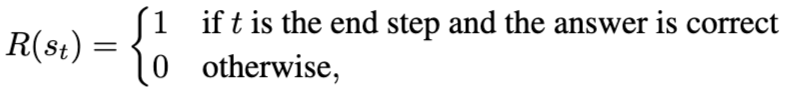 ๋ฌธ์ ์ ๋ํ ์ต์ข ๋ต๋ณ์ ๋ํด์ ์ ๋ต(1), ์ค๋ต(0)์ผ๋ก ๊ฒฐ๊ณผ์ ๋ํด์๋ง reward๋ฅผ ๋ถ์ฌํจ