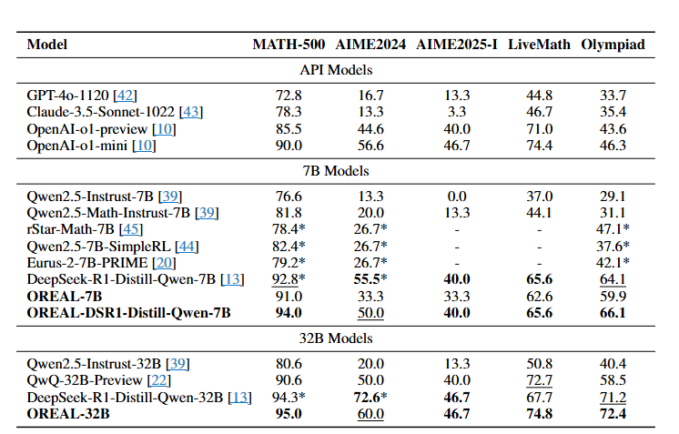 - OREAL-7B ๋ชจ๋ธ์ด RL ๋ง์ผ๋ก ์ข์ ์ฑ๋ฅ์ ๋. (์์ ๋ชจ๋ธ์์๋ ์ข์ ์ฑ๋ฅ. Distillation์ ์ฌ์ฉ์ํจ)