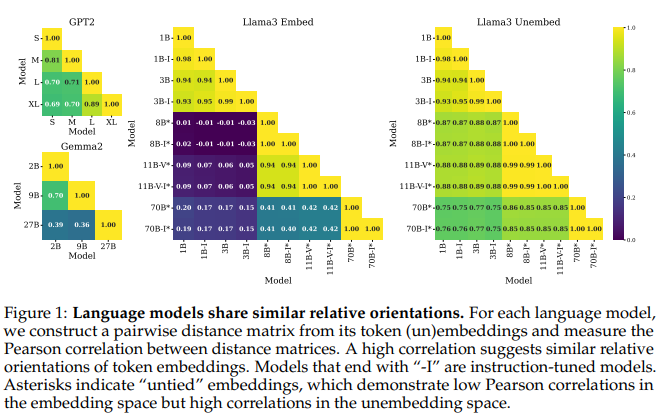 ๊ฐ์ ๊ณ์ด์ LLM๋ค์ token space์ ์ ์ญ ๊ตฌ์กฐ๊ฐ ๋น์ทํ๋ค