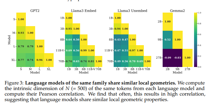 - ๋ชจ๋ธ ํฌ๊ธฐ๊ฐ ๋ฌ๋ผ๋, ๊ฐ์ ๊ณ์ด์ ๋ชจ๋ธ์ token vector๊ฐ ์๋์ ๋ฐฉํฅ ๊ด๊ณ๊ฐ ์ ์ง๋๋ค